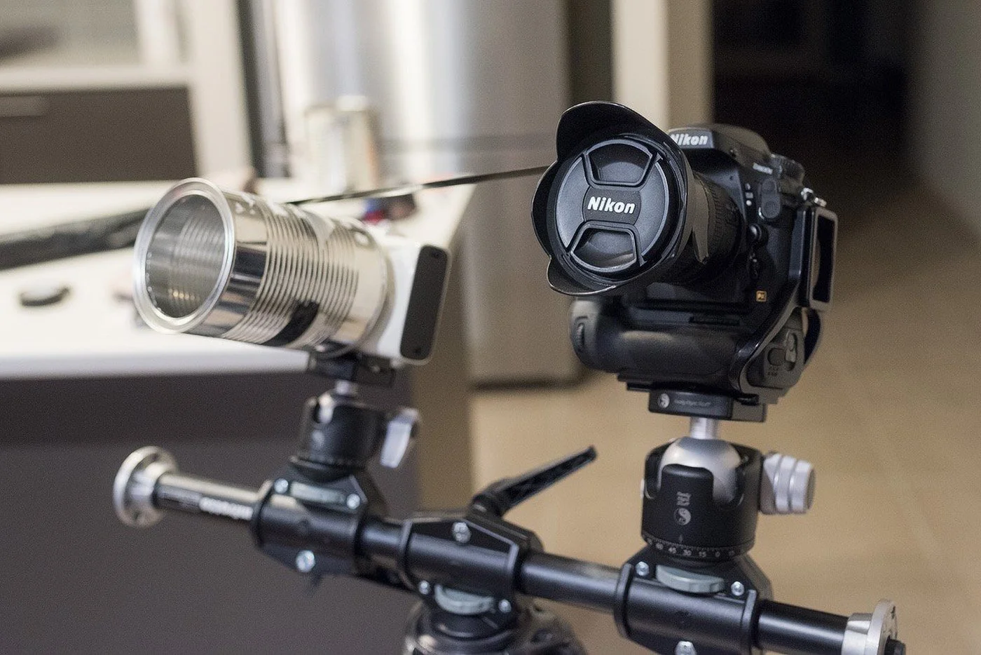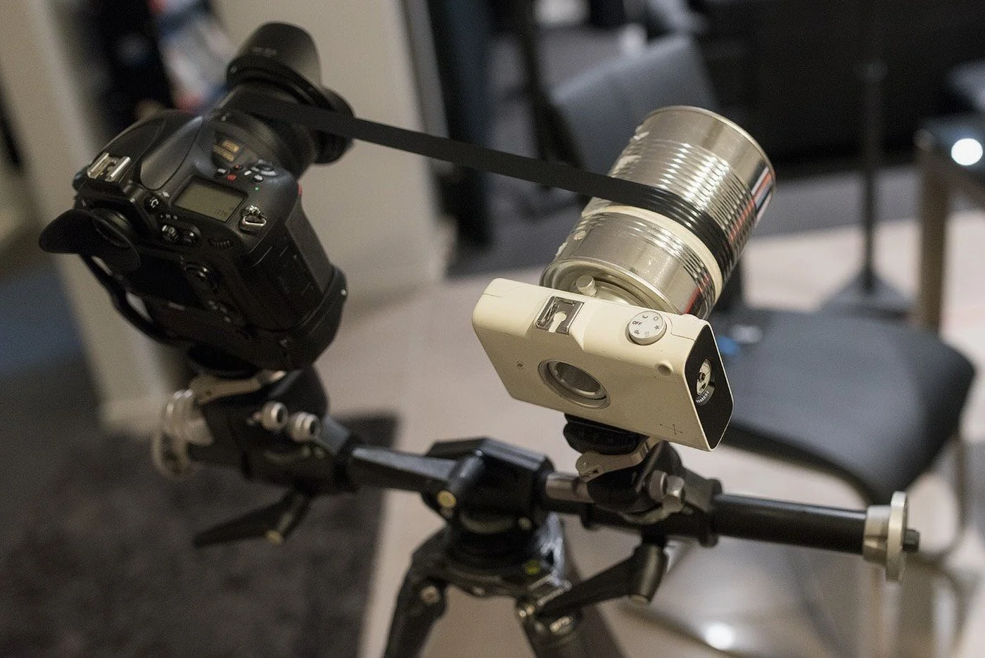 I ened up using a Vixen Polarie astro tracker as the drive for the zoom ring, a manfrotto tripod attachment that let me mount 2 heads side by side, a role of sticky tape and an empty Milo tin.
